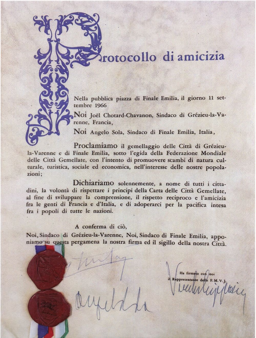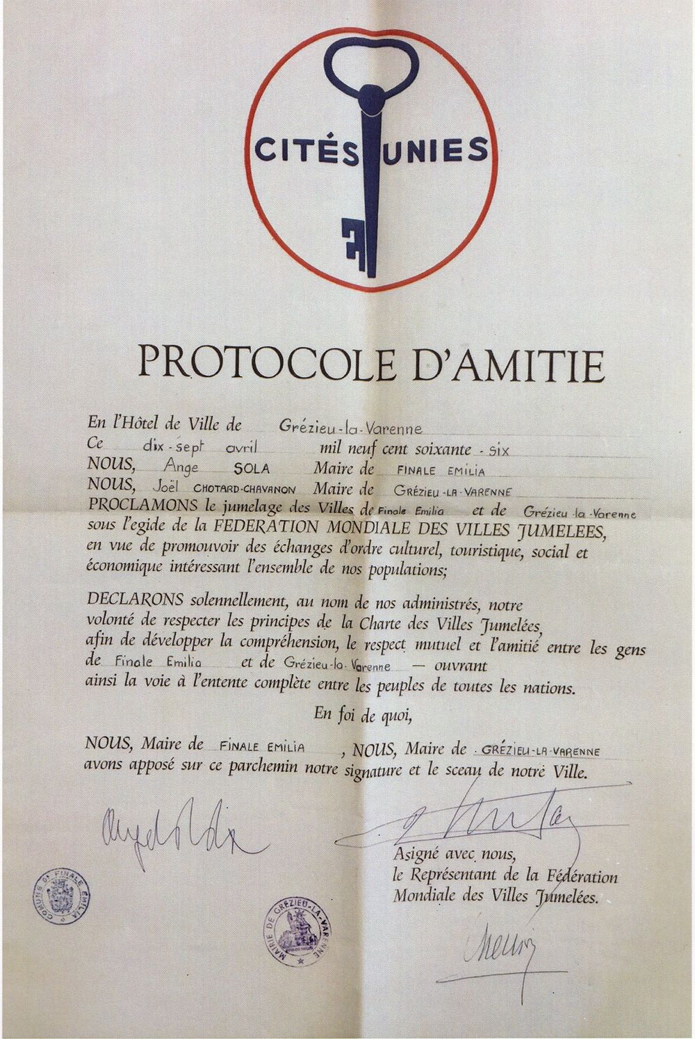 Discours de M.Angelo SOLA, Maire de Finale-Emilia, lors de la première rencontre à Grézieu-la-Varenne le 18 Avril 1966
